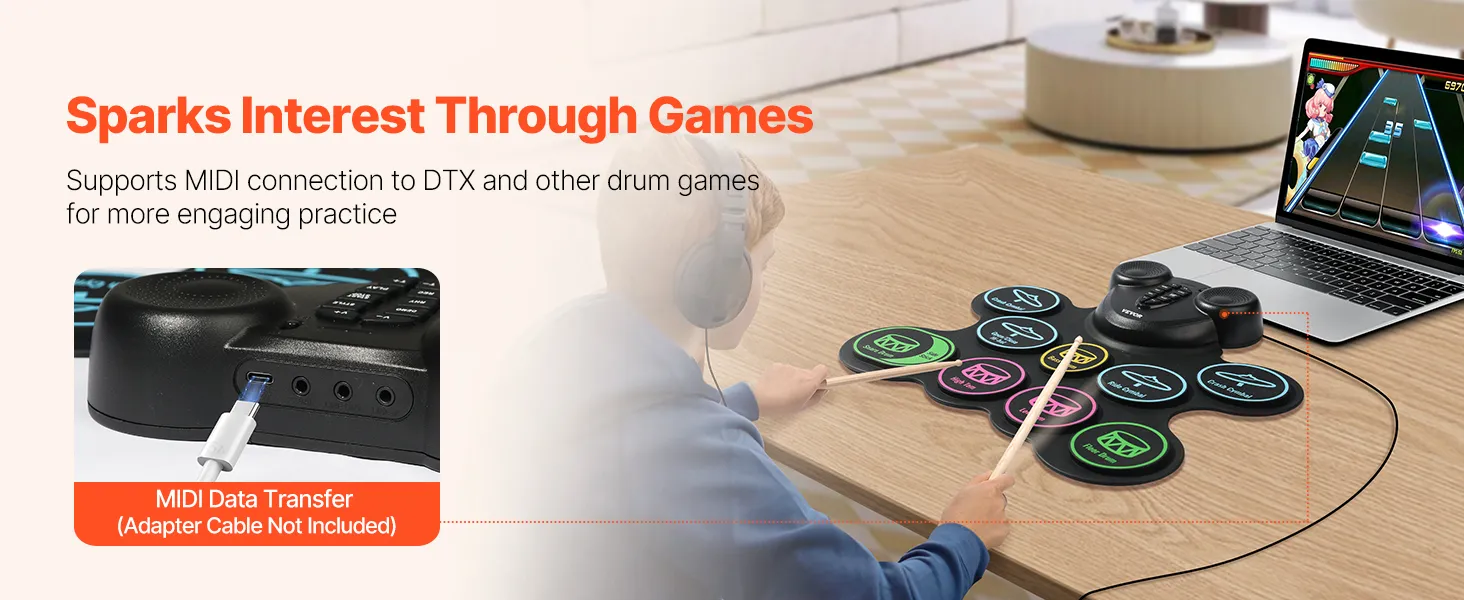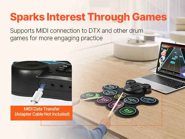 With MIDI support, our kids electric drum set can easily connect to computer or other devices. So that kids can use various music software for interactive learning, making practice more exciting and engaging.