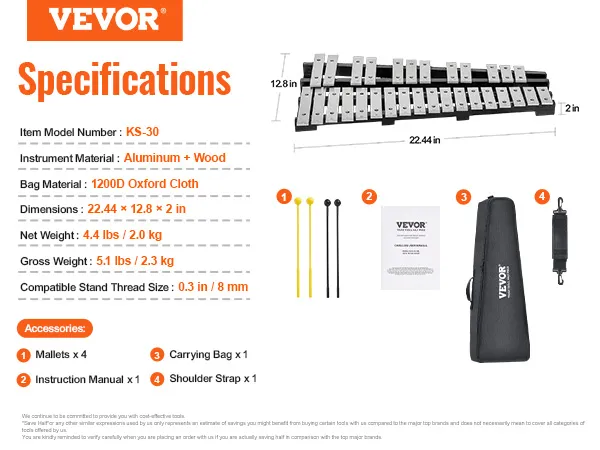 Het VEVOR 30-noten klokkenspel is perfect voor beginners. Het bevat alle noten die nodig zijn voor een complete muzikale ervaring. De 30 noten bieden een interdisciplinair scala aan geluiden. Dit maakt het eenvoudig voor een beginner om te leren en te spelen. Het ontwerp van het instrument is bedoeld om beginnende muzikanten te helpen bij het beginnen van hun muzikale reis. U kunt op een eenvoudige maar effectieve manier oefenen om beter te worden. De heldere, heldere tonen van het klokkenspel maken het leuk om te gebruiken. Dit is een handig hulpmiddel voor jonge muzikanten die hun vaardigheden willen ontwikkelen. Ons 30-notenbereik zorgt ervoor dat spelers een ontelbare verscheidenheid aan stukken kunnen leren.