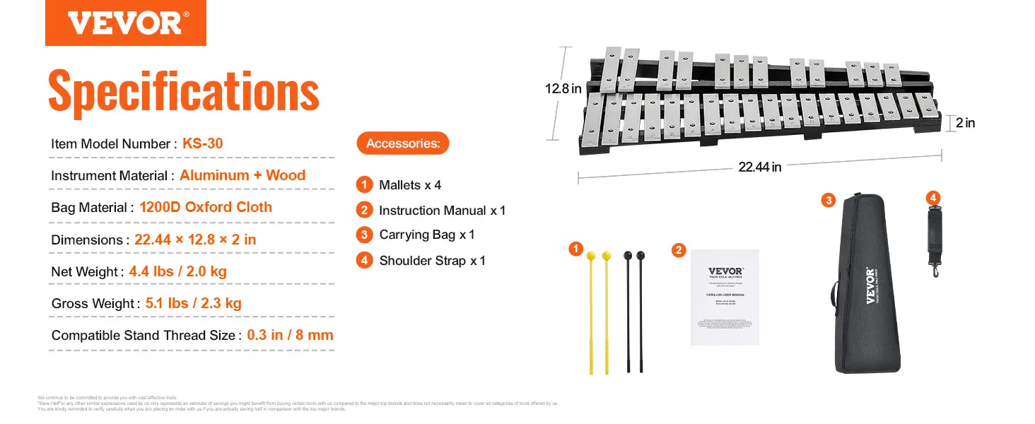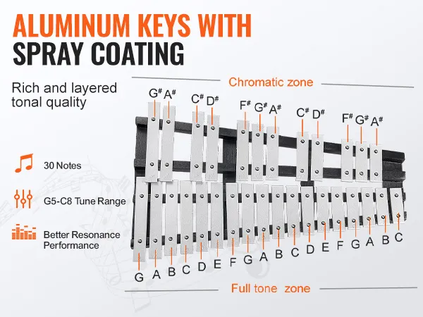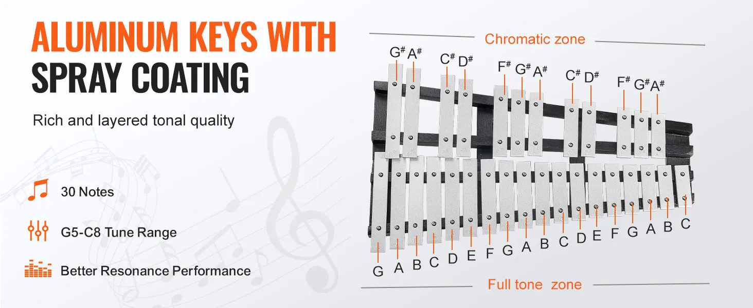Professioneel 30-toons klokkenspel: Het professionele 30-toons klokkenspel bevat 30 tonen (bereik: G5-C8) en twee rijen noten; de ene rij is voor halve tonen en de andere voor hele tonen. Dankzij de voortreffelijke lakafwerking levert het heldere en rijke tinten op. Elke aluminium staaf is professioneel afgesteld en elke noot is erop gemarkeerd.