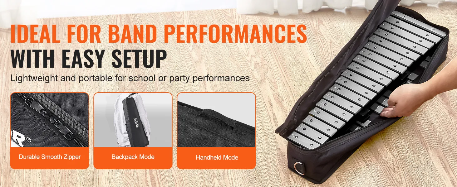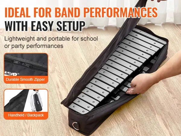 Het opzetten van het VEVOR klokkenspel is snel en eenvoudig. De standaard is stevig en eenvoudig in elkaar te zetten. Dit betekent dat kinderen het zelf in elkaar kunnen zetten. Het is ook een fluitje van een cent om mee te nemen. Bovendien is het lichtgewicht ontwerp eenvoudig te dragen. Jonge muzikanten kunnen zonder problemen oefenen of optreden. Het compacte formaat zorgt ervoor dat het in kleine ruimtes past. Het is perfect voor thuisgebruik of in een klaslokaal. De meegeleverde draagtas verbetert de draagbaarheid! Het is ongelooflijk handig voor jonge muzikanten die onderweg zijn. Eenvoudige montage en draagbaarheid maken het aanpasbaar voor praktisch gebruik.