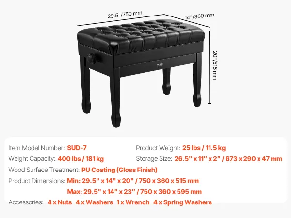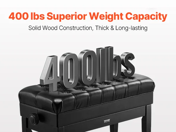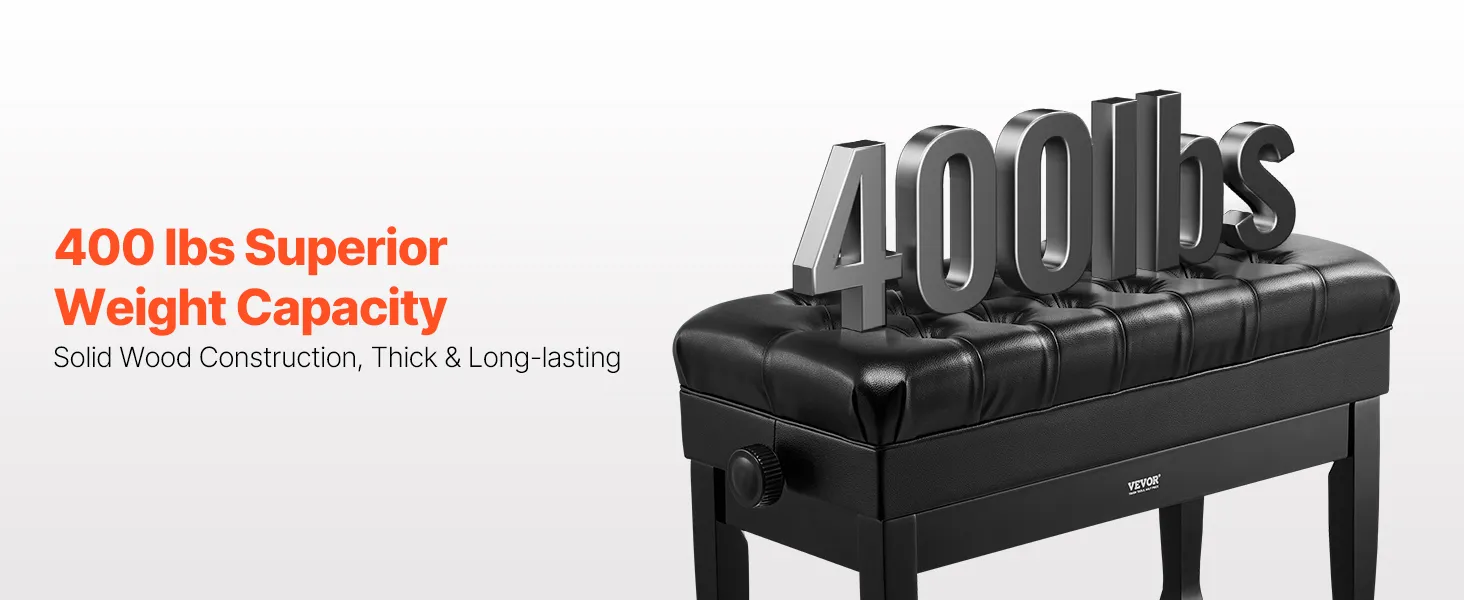 Duet Piano Bench: Designed with a 26.5" long seat, this duet piano seat comfortably accommodates two musicians. Featuring a robust 400lbs weight capacity, this piano seat is ideal for use in both home settings and professional studios. With its spacious design, it offers an ideal seat for shared music sessions.