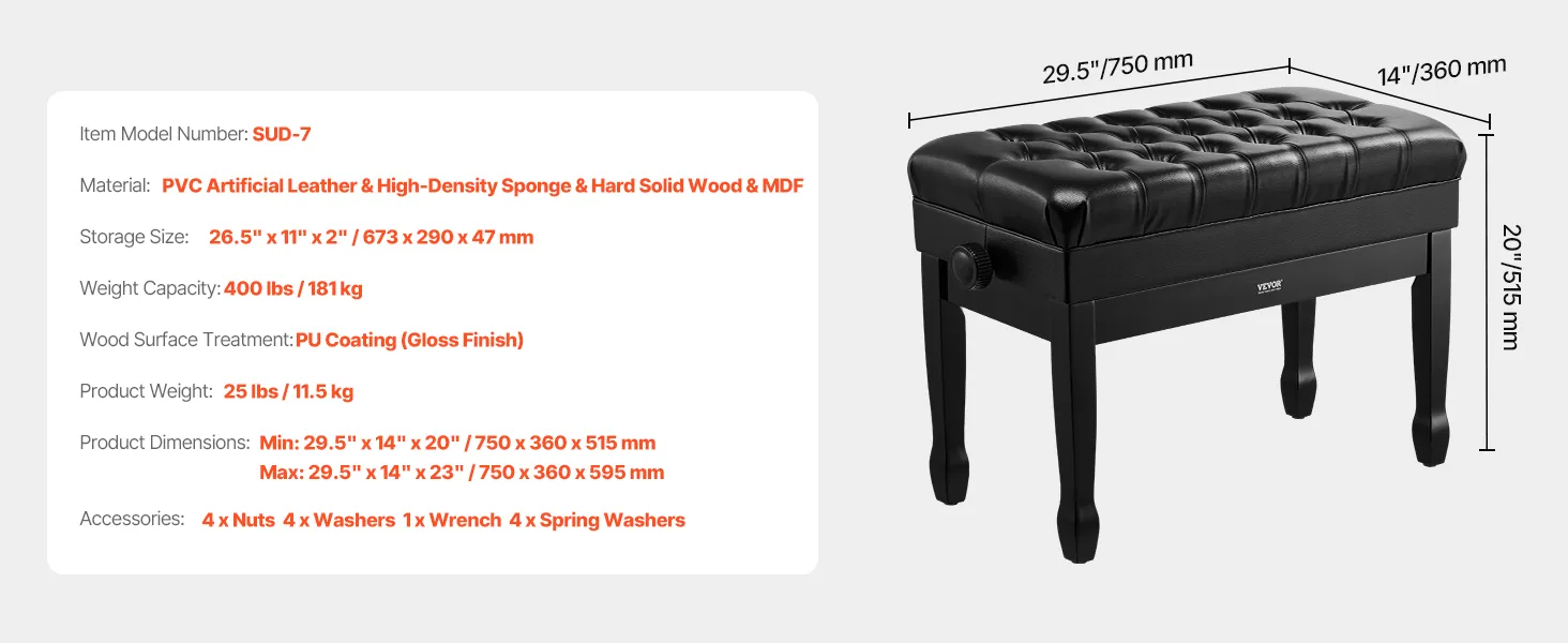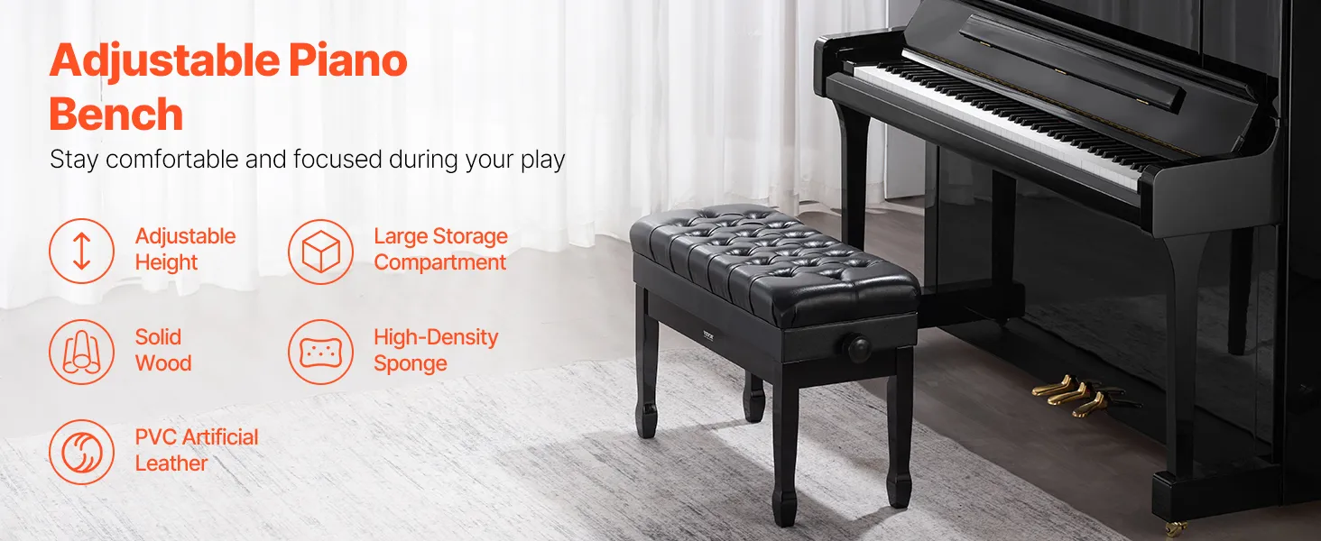 Ample Storage Compartment: With a 26.5" x 11" x 2" storage compartment, this piano bench gives you generous space for storing sheet music, music accessories, or personal items. Keep your space clean and organized while having everything you need close at hand.