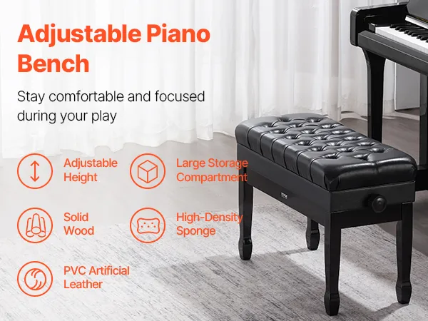 This duet piano bench offers a roomy seat with an adjustable height range of 20.3" to 23.4". The cushioned seat with high-density sponge provides comfort during long sessions, while the large storage compartment provides a neat space for music sheets and other accessories.