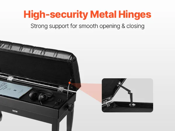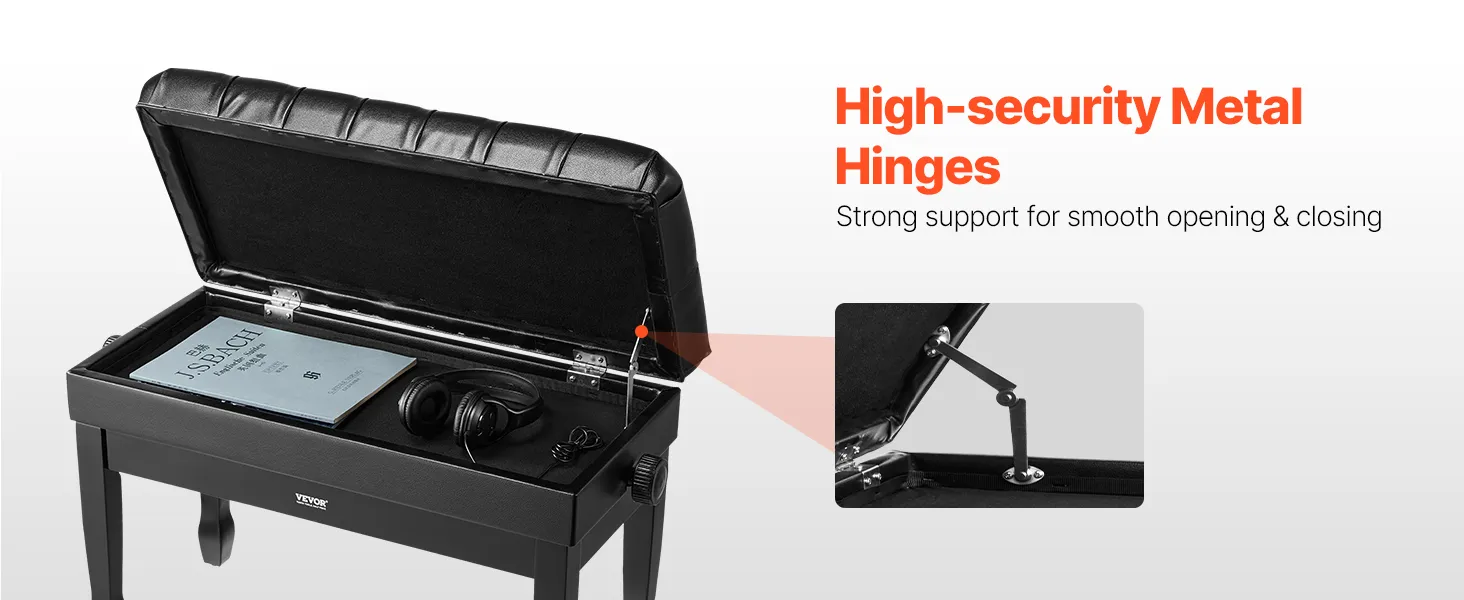 Designed with premium metal hinges, this piano stool provides steady support and smooth operation whenever you open or close it. These durable hinges allow easy access to the storage compartment while minimizing noise and friction, enhancing your playing experience.
