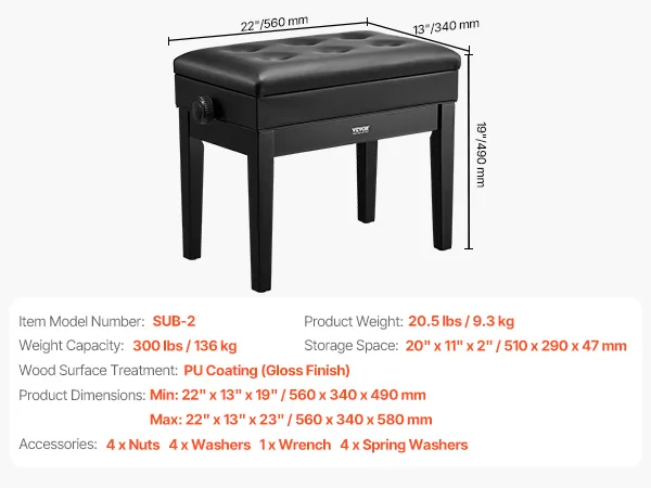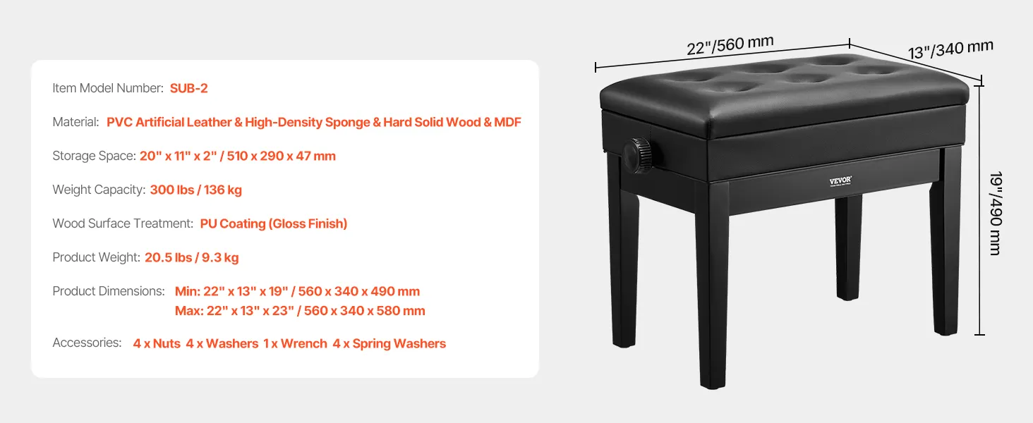 Adjustable Height for Comfort: This piano bench offers a rotating handle for easy height adjustment, ranging from 19.3" to 22.8". It's designed to suit a variety of playing scenarios and different user needs, making it an ideal choice for musicians looking for customized comfort.