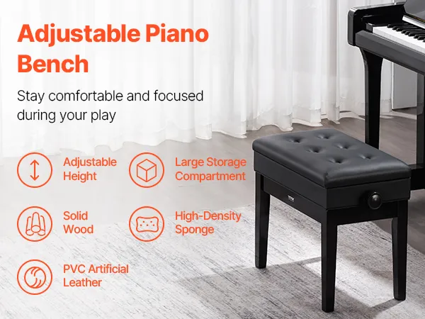 This piano bench offers comfort and support for musicians of all body shapes. With an adjustable height from 19.3" to 22.8", it adapts to your needs. The cushioned seat and large storage compartment help organize music and accessories.