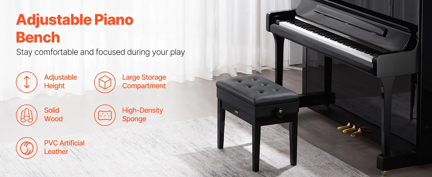 Spacious Piano Bench: Designed with a 13" wide seat, this piano seat offers plenty of space for musicians of all body shapes. Whether you're practicing for hours or enjoying a quick session, the generously padded seat provides comfort and support. Ideal for piano players, this bench ensures a relaxed and comfortable experience, no matter your body shape.