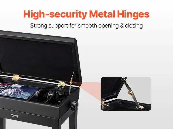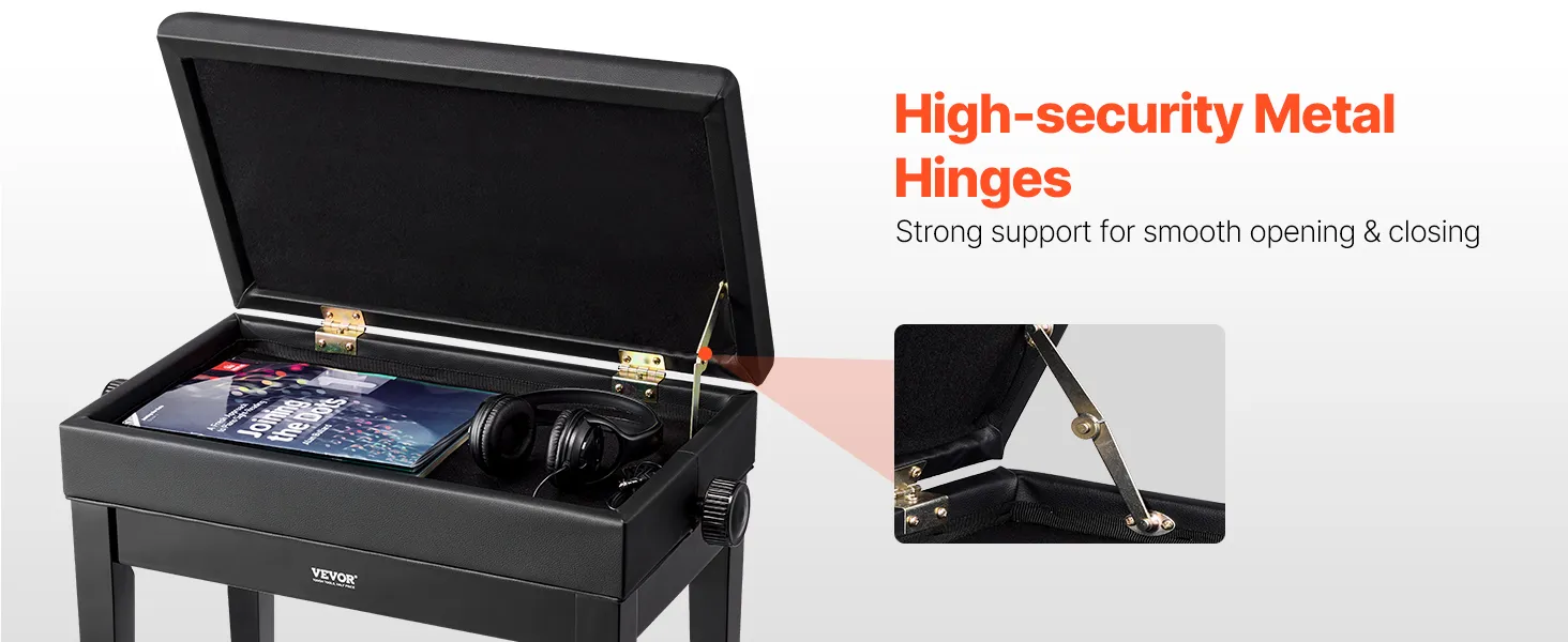 Designed with premium metal hinges, this piano stool provides steady support and smooth operation whenever you open or close it. These durable hinges allow easy access to the storage compartment while minimizing noise and friction, enhancing your playing experience.
