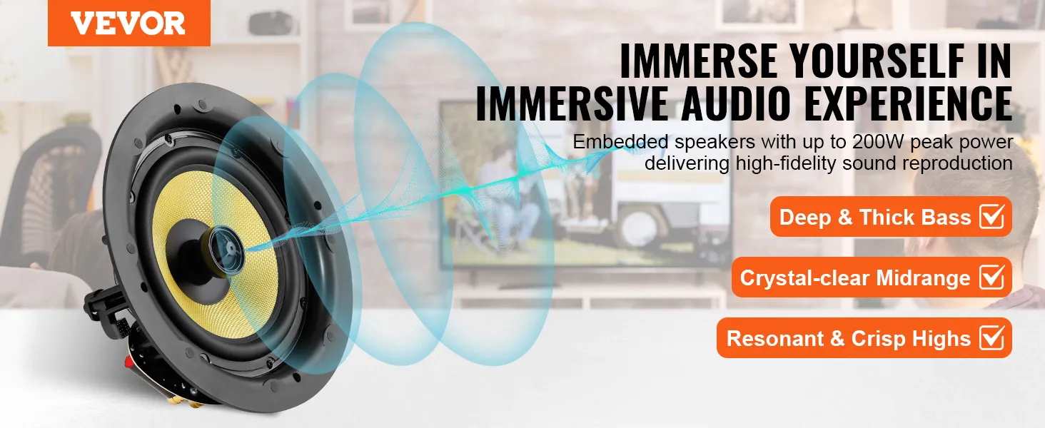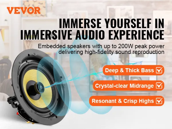 Elevate your audio experience to a new level! Our ceiling speaker seamlessly integrates into your ceiling with an embedded design. Featuring 200W max output power, a 8'' woofer, and a 1'' tweeter, it delivers unparalleled sound quality. Enjoy high-fidelity audio that brings every note to life!