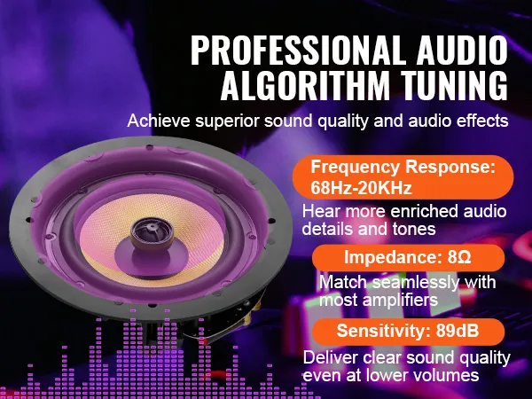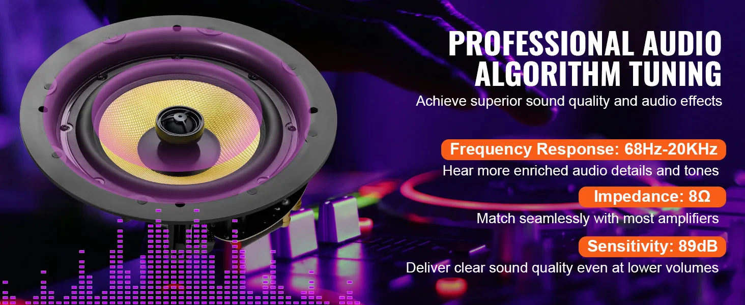 Our ceiling speakers boast a wide frequency response range, capturing rich audio details. With 8Ω impedance, it is compatible with a variety of audio equipment. An 89dB sensitivity means the speaker deliver clear, lifelike sound and impressive volume levels with the same power input.