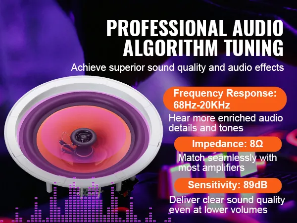 De flush mount speakers zijn gemaakt van een compacte 9,2'' diameter speaker met een embedded design. Het zorgt voor een eenvoudige installatie en een strakke, onopvallende look. Ongeacht of ze in de muur of in het plafond worden gemonteerd, ze passen naadloos bij elk decor om uw ruimte te transformeren met een rijk, meeslepend geluid. Geniet van een stijlvolle muzikale upgrade die elke kamer met gemak verbetert.
