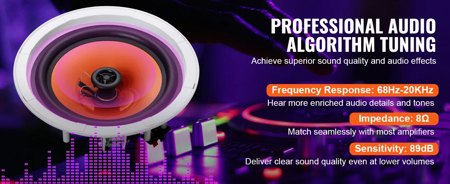 Unieke akoestische architectuur: Dompel uzelf onder in adembenemend helder geluid met onze plafondgemonteerde luidspreker. Elke luidspreker is uitgerust met een 8-inch woofer en een 1-inch tweeter en levert levensecht geluid dat uw muziek en films tot leven brengt. De innovatieve rubberen afdichtstrip en de robuuste ABS-behuizing voorkomen geluidsverlies en zorgen ervoor dat je elke noot in pure, briljante hifi-kwaliteit ervaart.