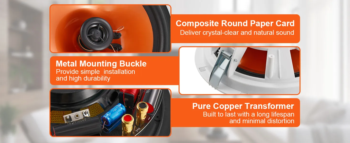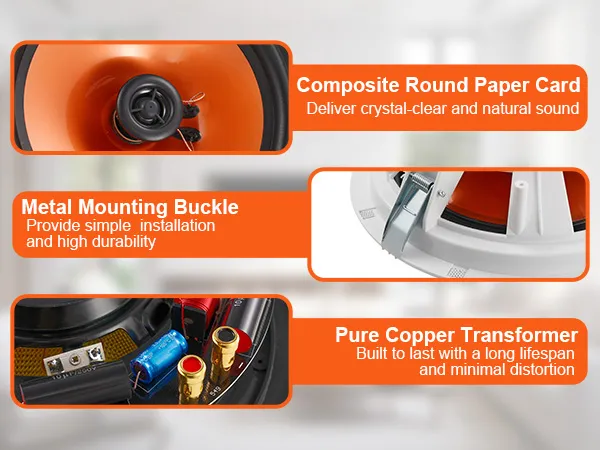 Uitgerust met een unieke akoestische architectuur, zorgt onze plafondluidspreker niet alleen voor een heldere en natuurlijke geluidskwaliteit, maar ook voor een stabiele en efficiënte krachtoverbrenging. Vervormingen en interferentie worden aanzienlijk verminderd.