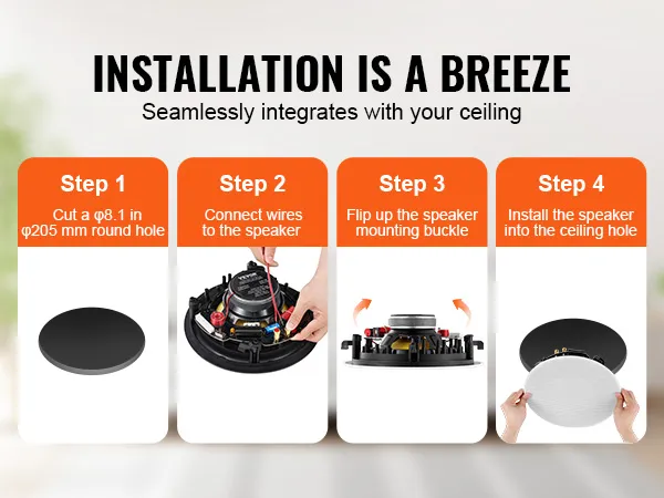 Eenvoudige installatie: transformeer uw ruimte in een handomdraai! Snijd eenvoudig een gat van φ8,1 inch (205 mm) in uw plafond, sluit de luidspreker aan op uw audio-ontvanger of versterker thuis via een kabel (kabel en versterker niet meegeleverd) en bevestig hem via de bevestigingsgesp aan het plafond. Voor grotere ruimtes breidt u uw opstelling uit met meerdere luidsprekers voor een uitgebreide geluidsdekking. Elke hoek van uw kamer is gevuld met rijk geluid van hoge kwaliteit.
