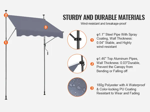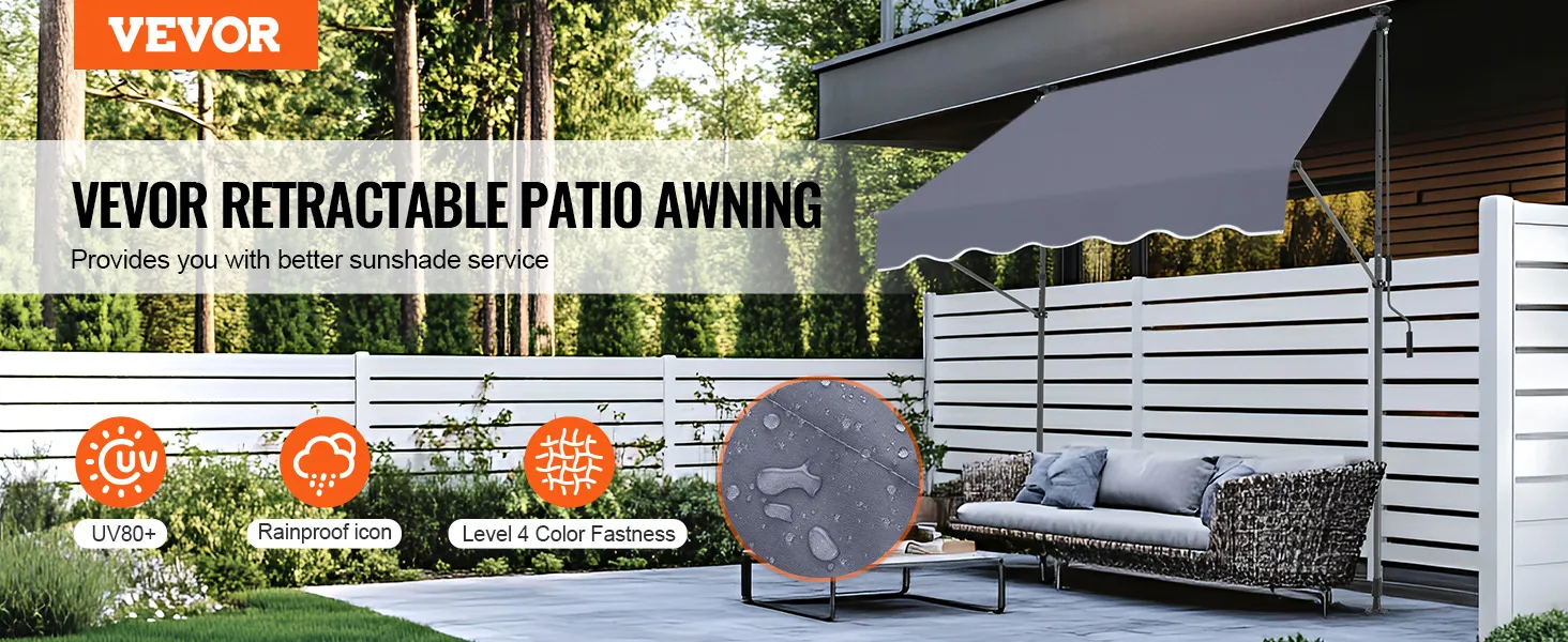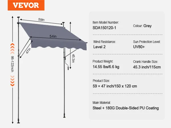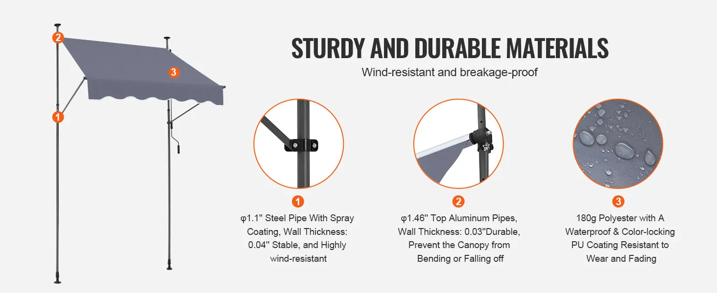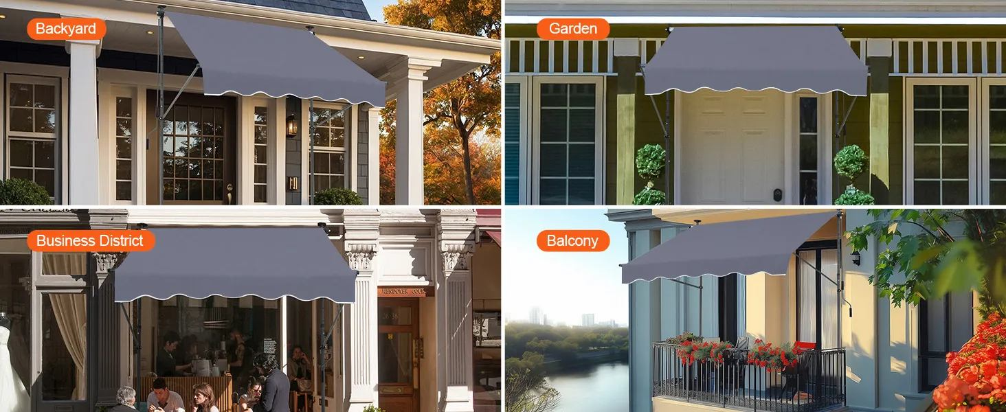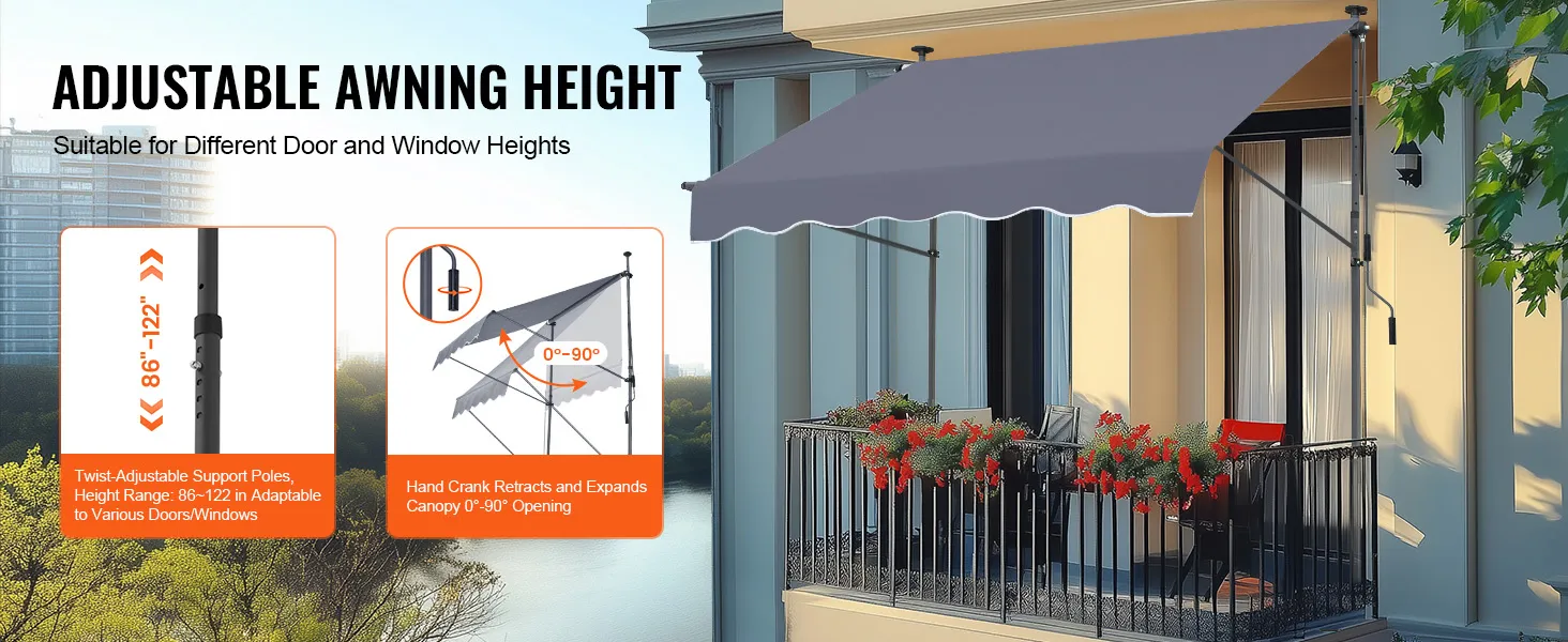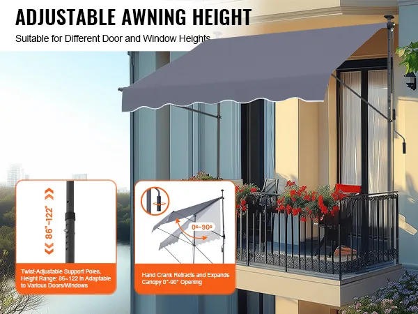 Deze handmatig intrekbare luifel is voorzien van een draaibare steunpaal en maakt hoogteverstelling mogelijk voor verschillende deur- en raamformaten, waardoor de veelzijdigheid van terrasoverkappingen wordt vergroot.