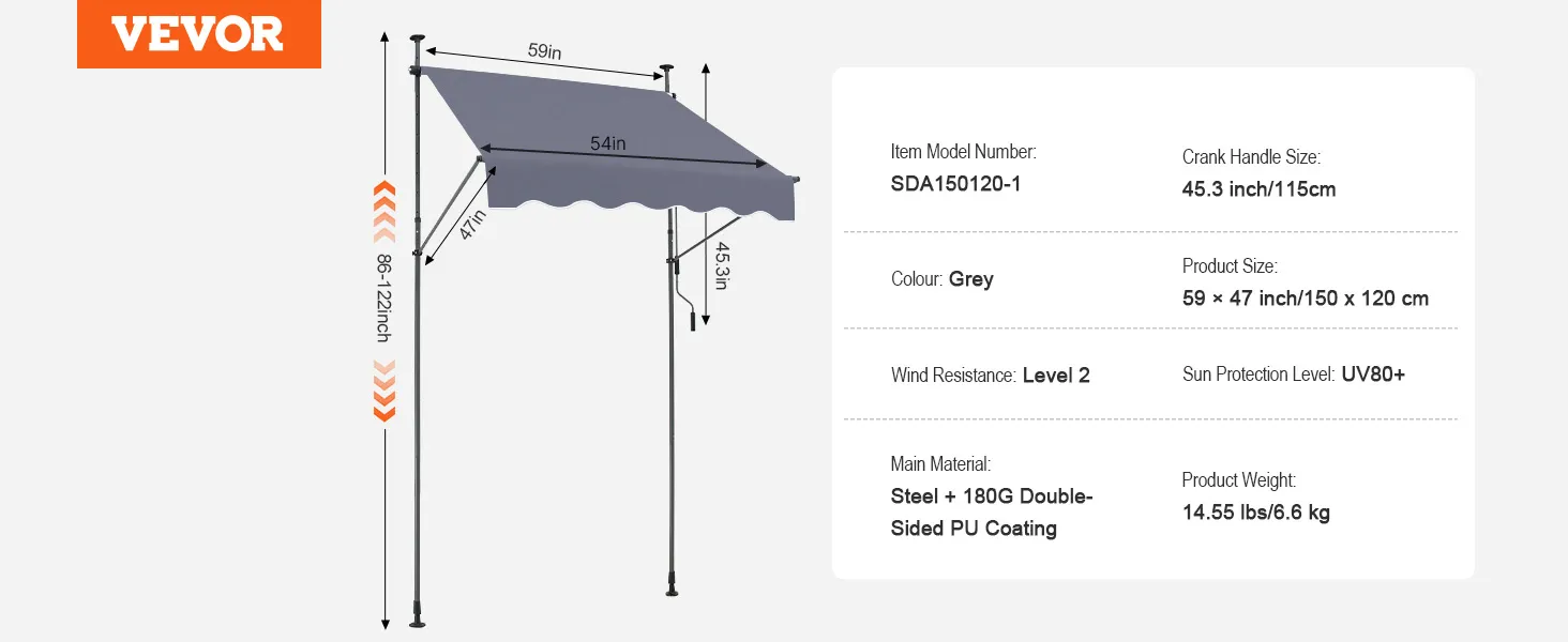 Zonbescherming en waterdicht: Heeft u nog steeds last van de zomerhitte? Deze grote uitschuifbare terraszonwering (150 x 120 cm) is voorzien van een waterdichte 180 g Lock Color PU-coating en biedt UV80+ bescherming, waardoor het de ideale luifel is om te ontspannen op het terras.
