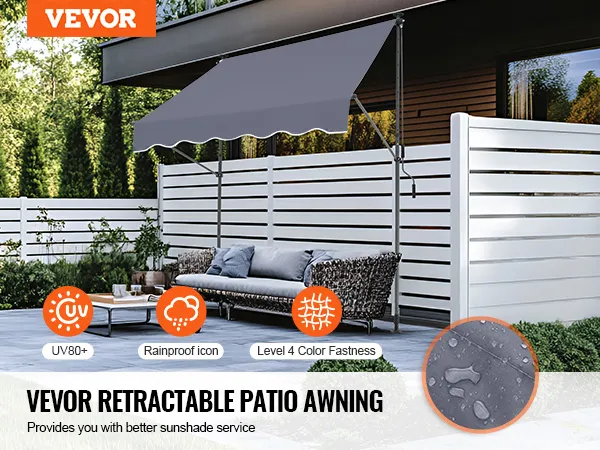 De 180 g waterdichte PU-coating in slotkleur op deze intrekbare terrasoverkapping biedt UV80+ bescherming, waardoor het de perfecte luifel is om te ontspannen op het terras.