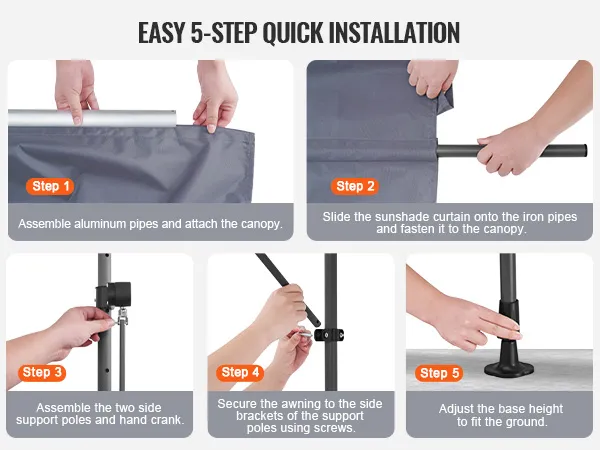 Omdat boren niet nodig is, wordt deze uittrekbare terrasoverkapping gebruikt voor een veilige bevestiging met gespen en schroeven, waardoor de montage door twee personen eenvoudig is.