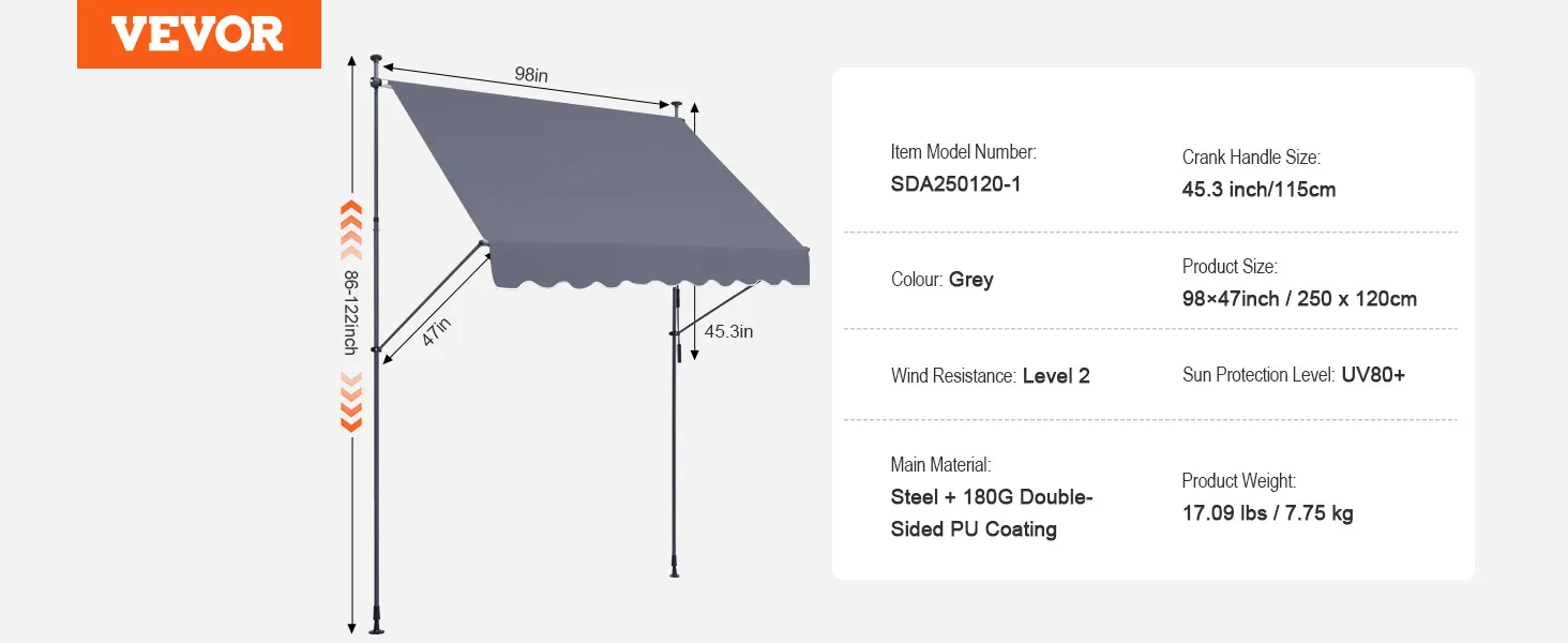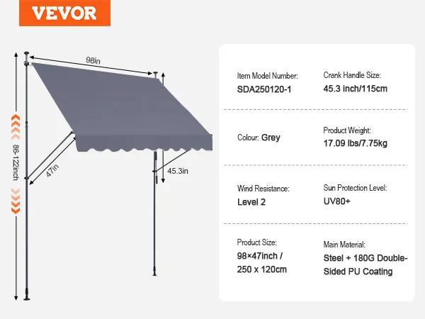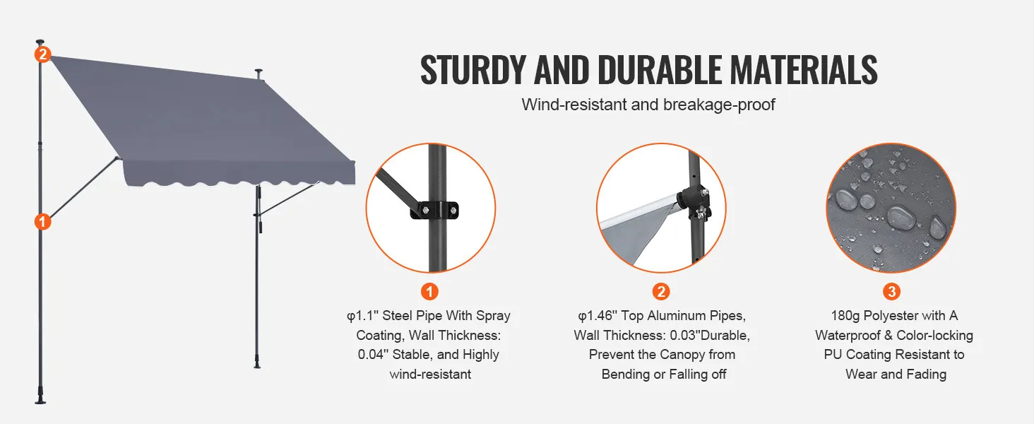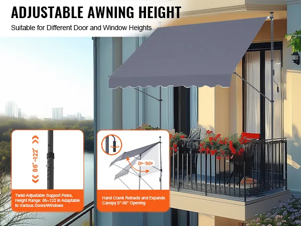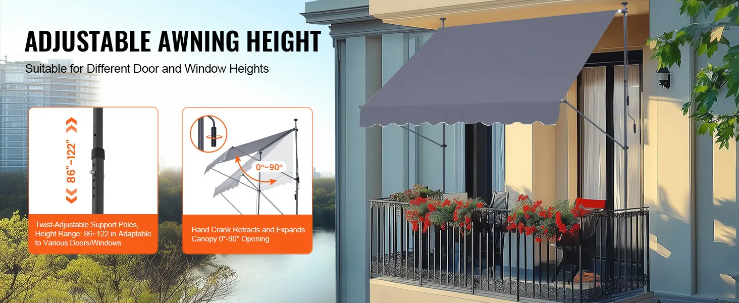 Easy to Adjust: This manual retractable awning allows for height adjustments between 86-122 inches, accommodating various door and window heights, providing flexibility for your outdoor space.