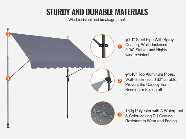 Sturdy and Durable: The retractable awning is supported by thickened steel pipes for high strength and wear resistance, ensuring stability even in windy conditions, perfect for retractable awnings for patio use.