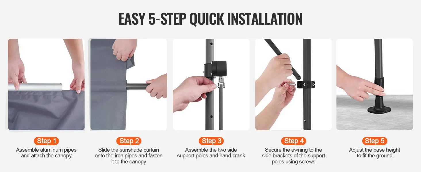 With no drilling needed, this patio awning retractable utilizes buckles and screws for secure installation, making it a straightforward assembly process for two people.