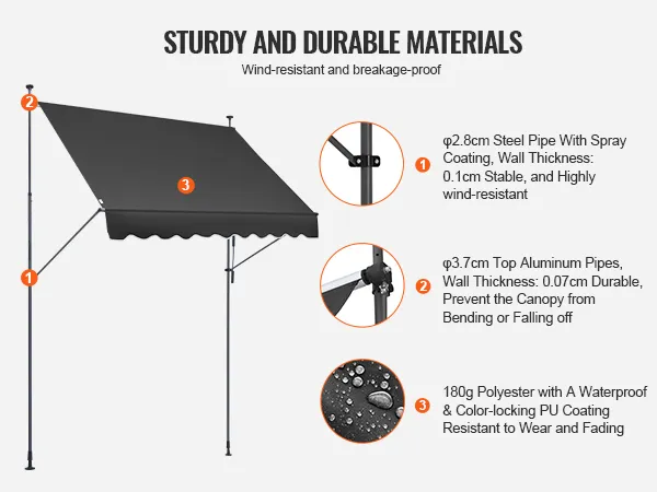 Sturdy and Durable: The retractable awning is supported by thickened steel pipes for high strength and wear resistance, ensuring stability even in windy conditions, perfect for retractable awnings for patio use.