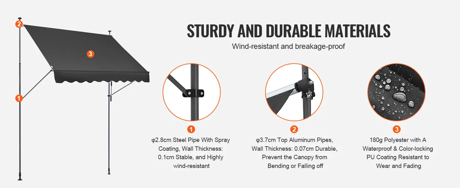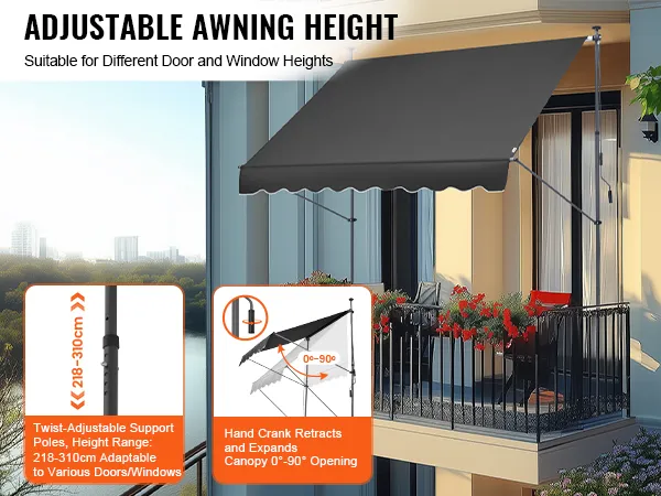 Featuring a twistable support pole, this manual retractable awning allows for height adjustments to accommodate various door and window sizes, enhancing versatility for patio awnings.