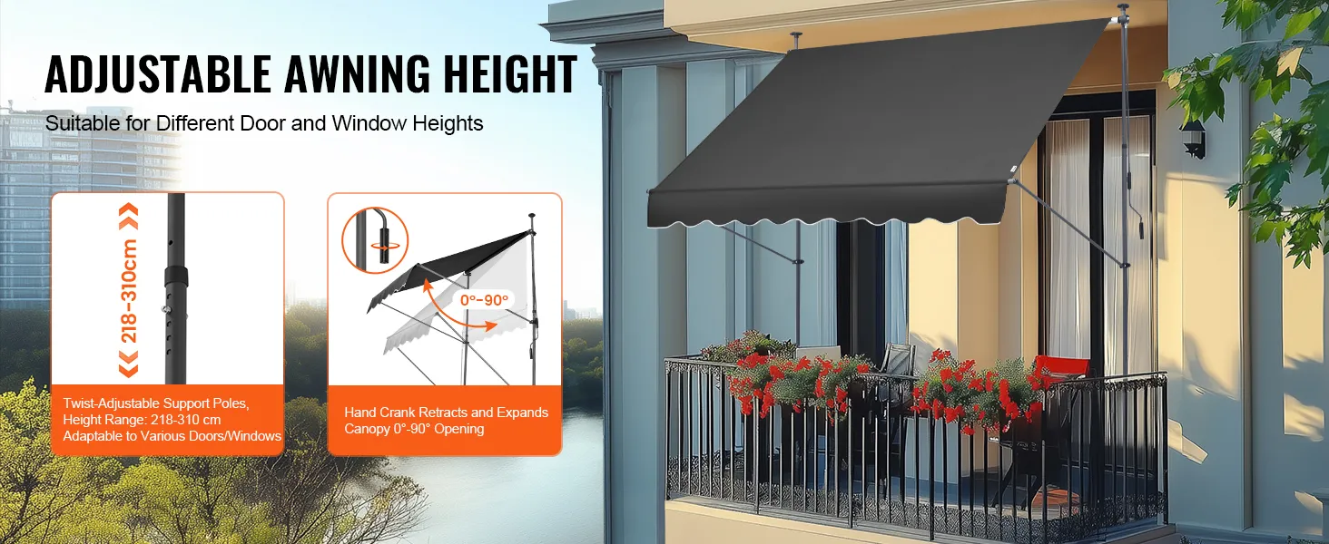 Easy to Adjust: This manual retractable awning allows for height adjustments between 86-122 inches, accommodating various door and window heights, providing flexibility for your outdoor space.