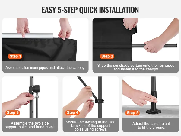 With no drilling needed, this patio awning retractable utilizes buckles and screws for secure installation, making it a straightforward assembly process for two people.