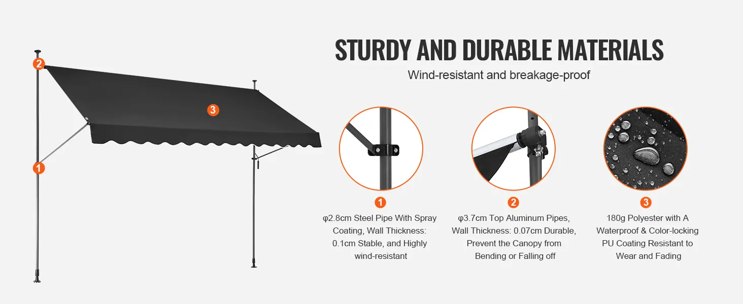 Sturdy and Durable: The retractable awning is supported by thickened steel pipes for high strength and wear resistance, ensuring stability even in windy conditions, perfect for retractable awnings for patio use.