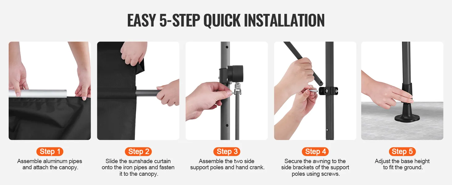 With no drilling needed, this patio awning retractable utilizes buckles and screws for secure installation, making it a straightforward assembly process for two people.