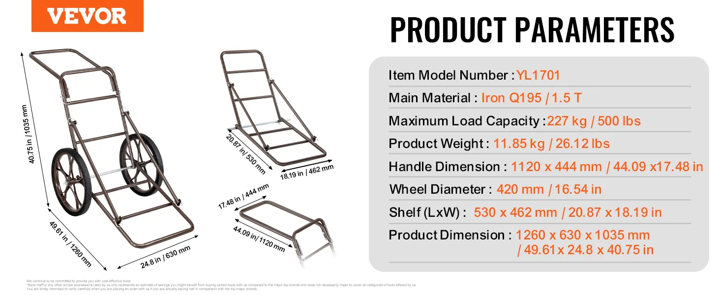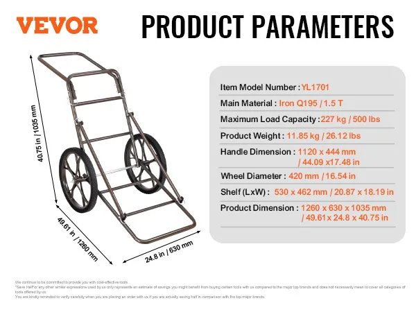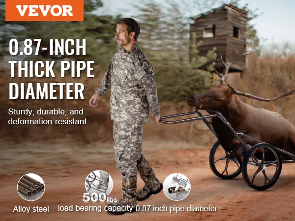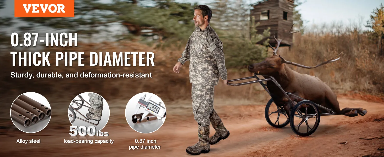 Hoge laadcapaciteit: deze uitstekende hertenwagen is gemaakt van gelegeerd staal met een buisdiameter van 0,87 inch (ca. 22 mm) en biedt een laadvermogen tot 227 kg (500 lbs), waardoor hij ideaal is voor het transporteren van uitrusting en wild tijdens de jachten. Hij kan ruw terrein doorkruisen en zonder problemen op zijn bestemming aankomen, wat cruciaal is voor jagers.