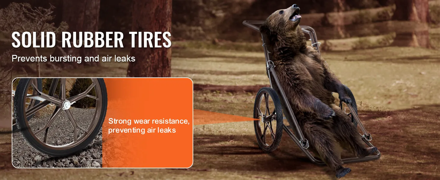 Massieve banden: In tegenstelling tot opblaasbare banden maakt deze opvouwbare jachtwagen gebruik van 17-inch massief rubberen banden, waardoor het risico op lekke banden en luchtlekken wordt geëlimineerd en de wagen duurzaam wordt op verschillende terreinen. De grotere banddiameter maakt het transport eenvoudiger en flexibeler. Bovendien heeft de trekhaak van de band een ringslot-ontwerp, dat meer veiligheid biedt in vergelijking met traditionele rechte haakverbindingen, waardoor de stabiliteit van de kar wordt gegarandeerd en demontage wordt voorkomen.