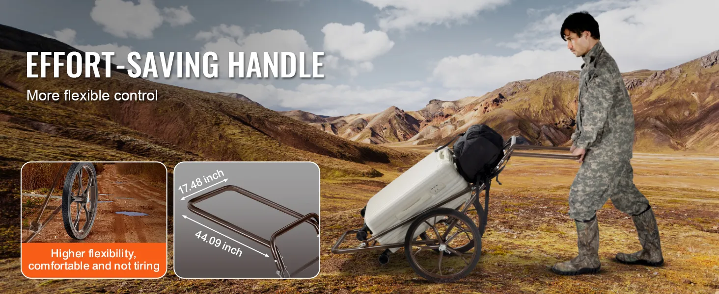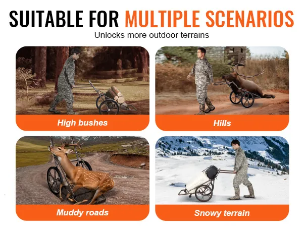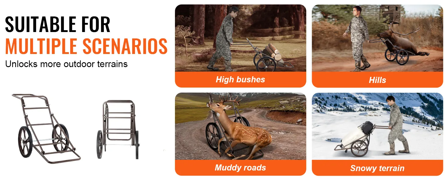 Geschikt voor verschillende soorten terrein: Dankzij de gemakkelijke wendbaarheid en stevige constructie is de multifunctionele wagen geschikt voor het vervoeren van jachttrofeeën, uitrusting, brandhout, kampeeruitrusting en nog veel meer. Hij kan verschillende soorten terrein aan, zoals hoge struiken, modderige wegen en bergpaden, waardoor het een veelzijdig vervoermiddel is, zowel in het wild als thuis.