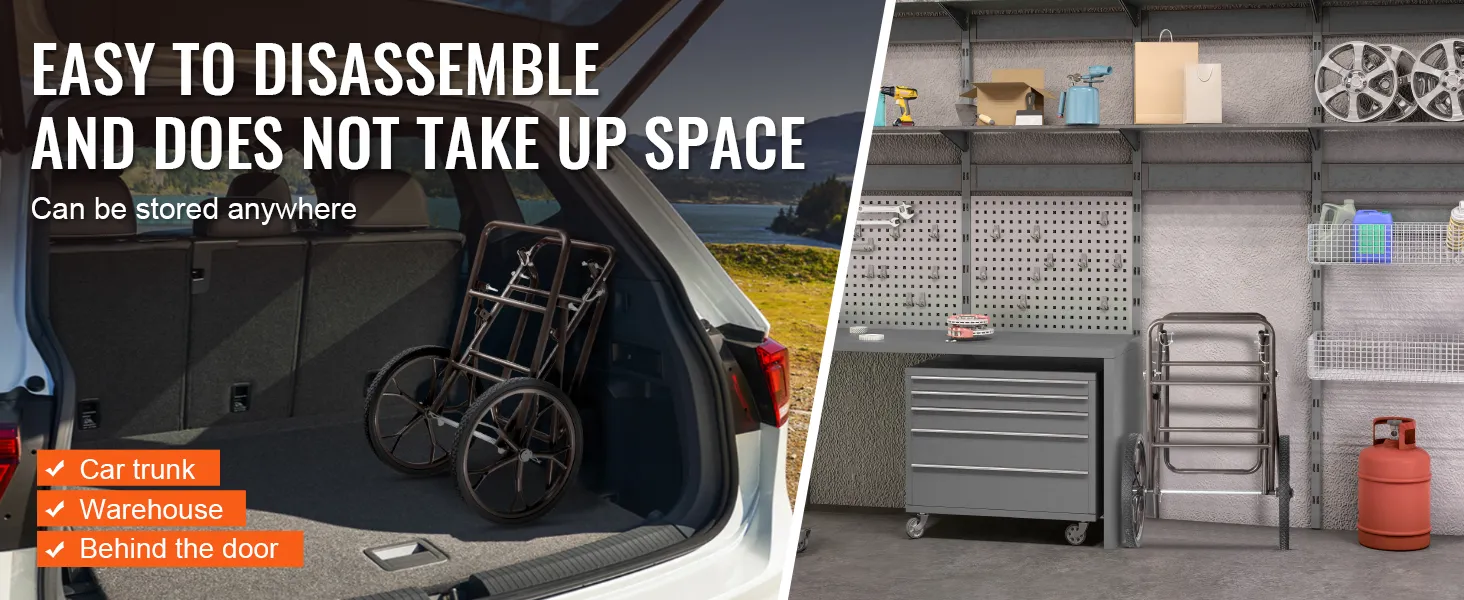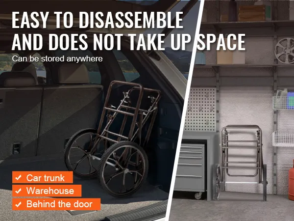 De universele transportwagen is niet alleen geschikt voor het transporteren van zware lasten, maar kan ook eenvoudig worden opgevouwen en opgeborgen. Dankzij de lichtgewicht constructie kan hij snel worden opgevouwen en neemt hij weinig ruimte in beslag.