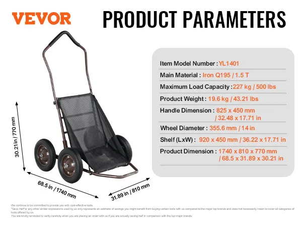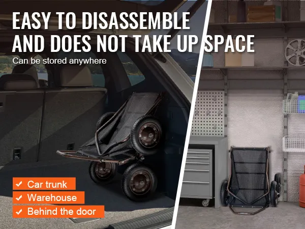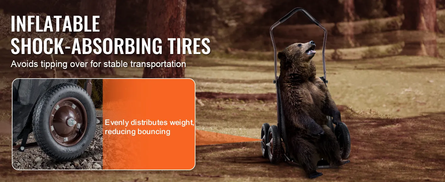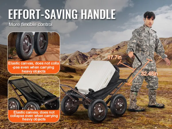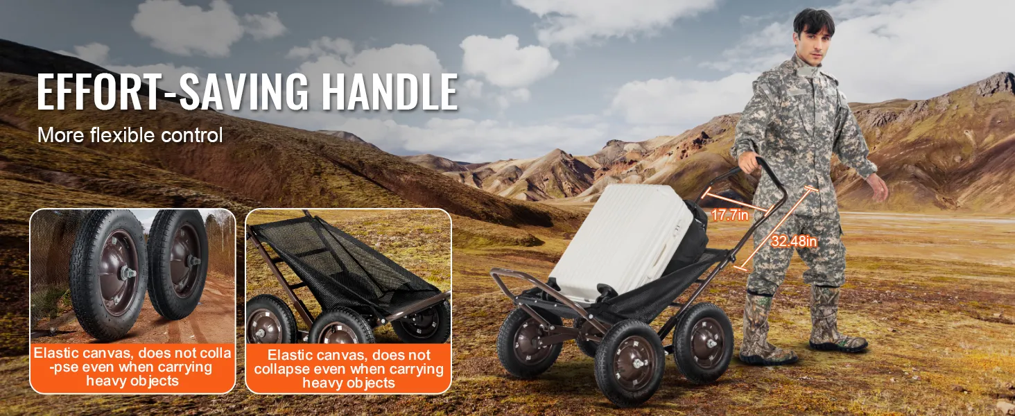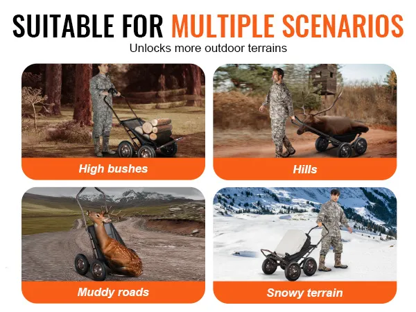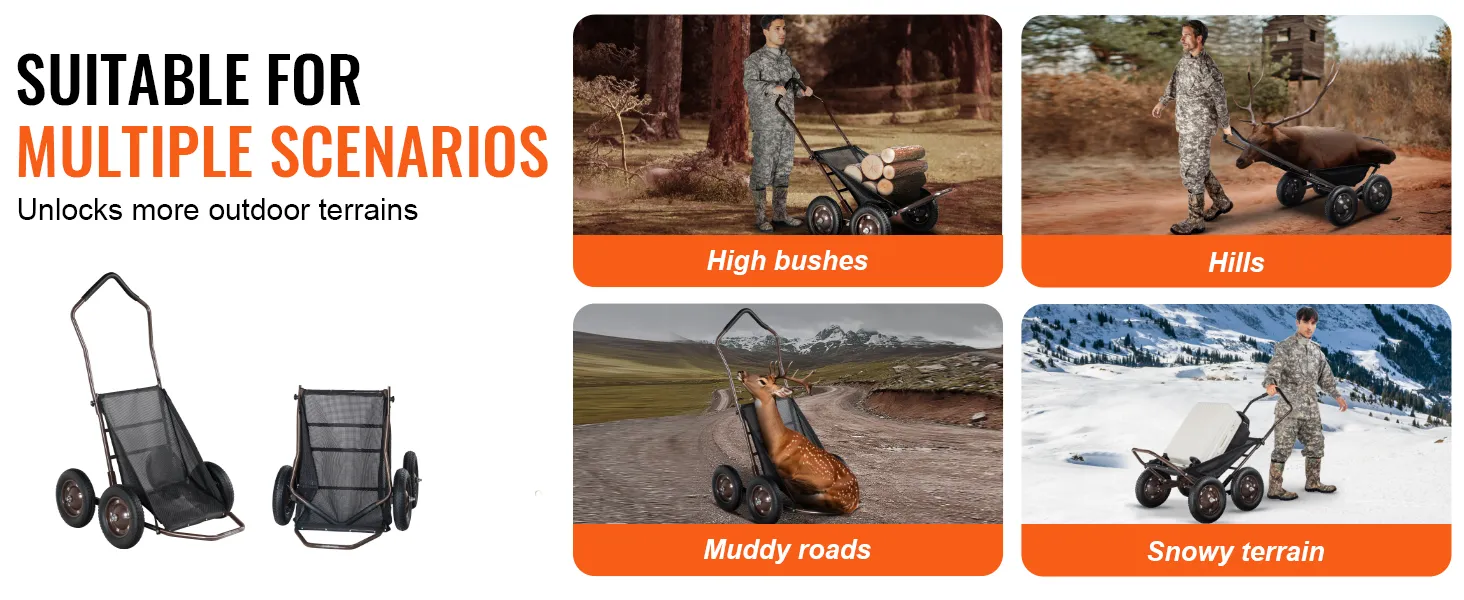 Geschikt voor verschillende soorten terrein: Dankzij de gemakkelijke wendbaarheid en stevige constructie is de multifunctionele wagen geschikt voor het vervoeren van jachttrofeeën, uitrusting, brandhout, kampeeruitrusting en nog veel meer. Hij kan verschillende soorten terrein aan, zoals hoge struiken, modderige wegen en bergpaden, waardoor het een veelzijdig vervoermiddel is, zowel in het wild als thuis.