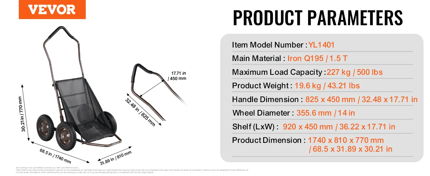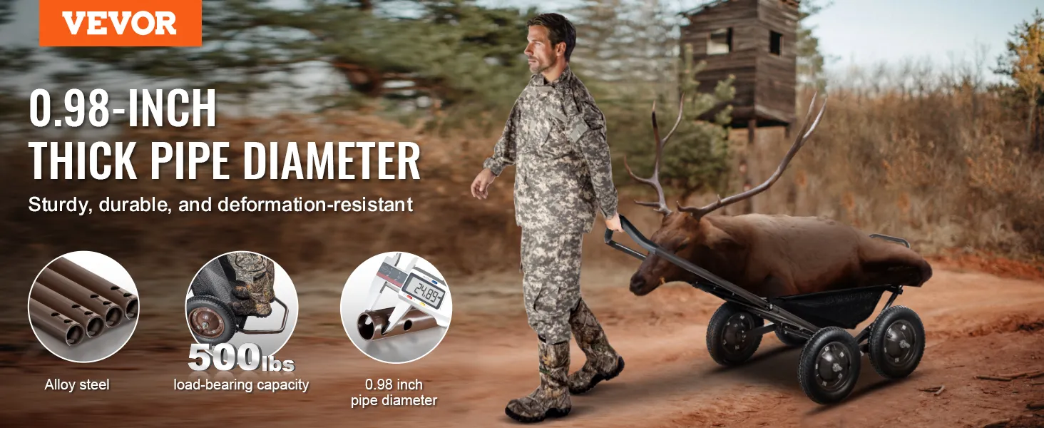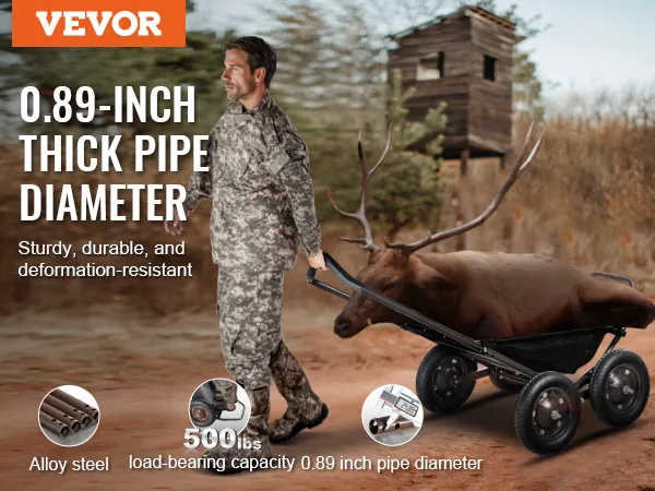 Hoog laadvermogen: deze uitstekende hertenwagen is gemaakt van gelegeerd staal en biedt een laadvermogen tot 227 kg, waardoor hij ideaal is voor het vervoeren van uitrusting en wild tijdens de jacht. Hij kan ruw terrein doorkruisen en gemakkelijk zijn bestemming bereiken, wat cruciaal is voor jagers.