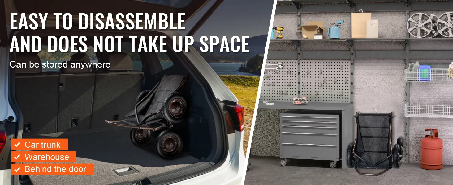 De universele transportwagen is niet alleen geschikt voor het transporteren van zware lasten, maar kan ook eenvoudig worden opgevouwen en opgeborgen. De lichtgewicht constructie maakt snel opvouwen mogelijk en neemt weinig ruimte in beslag.