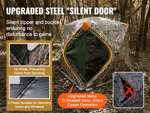 The ground blind is equipped with an upgraded metal support zipper door. The door can be pulled and buckled quietly, reducing noise and preventing the game from being startled.