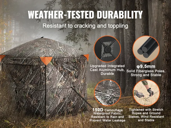 Dit is gebaseerd op een donker camouflagepatroon. Het helpt om op te gaan in verschillende omgevingen. De schuilhut blijft verborgen voor het wild, zelfs op korte afstand. Camouflage werkt goed in kreken en rivierbases, wat het geschikt maakt voor verschillende jachtterreinen. Daarnaast zorgt het ontwerp van de schuilhut ervoor dat u onopgemerkt blijft. Dit vergroot uw kansen op een succesvolle jacht. Een belangrijk kenmerk van de VEVOR-jachthut is de verbeterde camouflage. U kunt het wild heimelijk benaderen. Dit geeft u een ongelooflijk belangrijk voordeel in het veld.