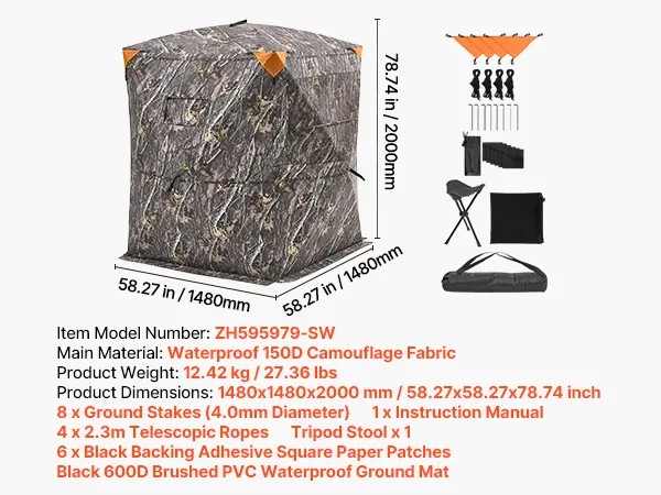 Ruim ontwerp: Met afmetingen van 148 x 148 x 200 cm (58,27 x 58,27 x 78,74 inch) biedt onze kalkoen- en hertenhut voldoende binnenruimte voor 2-3 personen. De stof met goed zichtbare ruitpatroon is afneembaar voor een betere zichtbaarheid. Een zitje is inbegrepen voor extra comfort tijdens lange jachten.