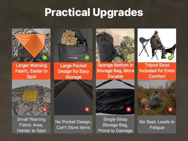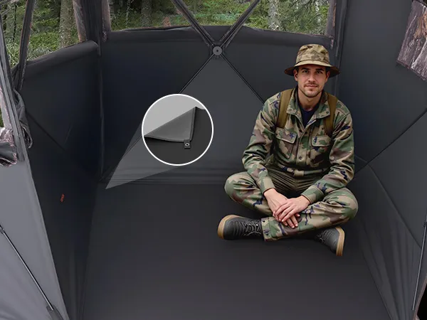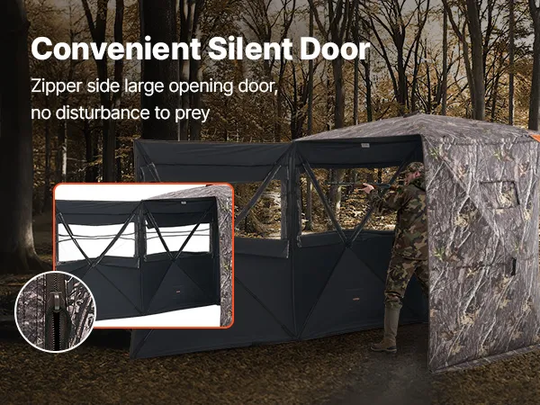 Upgrade voor stille jacht: de jachthut maakt gebruik van een stille methode met een intern gestikte stalen staafconstructie. De deur is afsluitbaar en heeft een automatische ritssluiting. Drie zijden met eenrichtingsgaasvensters bieden een breed zicht en gemakkelijk volgen.