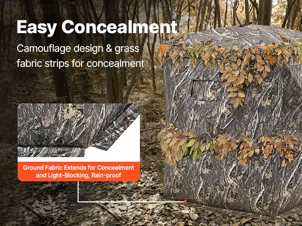 Uniek camouflageontwerp: de camouflage voor de hertenjacht heeft een stille metalen rits en een grote opening aan de zijkant. De bovenste en middelste ringen kunnen worden voorzien van stroken grasdoek. Aan de onderkant bevindt zich een 10 cm breed gronddoek voor camouflage en lichtblokkering.