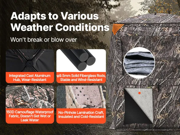 Weerbestendig: Een gatenvrij lamineringsproces met hittegeseald katoen houdt de tent geïsoleerd en koudebestendig. Onze verbeterde aluminium naaf heeft een robuuste constructie. De jachttent is gemaakt van waterdicht 150D-materiaal en is regen- en windbestendig. De massieve glasvezelbuizen zijn afneembaar. Reflecterende stof kan worden bevestigd.