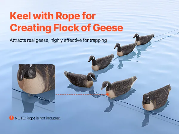 Simuleert drijvend en flexibel gebruik: de exclusieve kiel maakt eenvoudige bevestiging met elk touw mogelijk, waardoor de ganzenlokvogel op natuurlijke wijze kan wiegen of drijven met de stroming of een licht briesje. Dit simuleert de dynamische beweging van een echte zwerm ganzen.