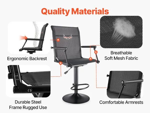 Comfort de hele dag: Deze ergonomische jachtstoel heeft een ademende, onderhoudsvriendelijke stoffen zitting en gewatteerde armleuningen voor extra ondersteuning. Hij is ontworpen voor langdurig zitten en is ideaal voor de jacht en andere buitenactiviteiten.