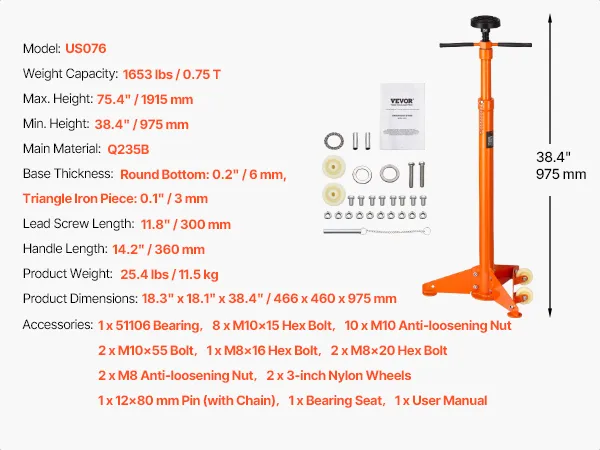 The robust 3/4-ton (1653.5 pounds) load-bearing capacity provides the strength and reliability needed for automotive lifting. Constructed using Q235B steel, this hoist stand is durable and resistant to deformation and bending. It's the ideal and dependable tool for lifting vehicles.