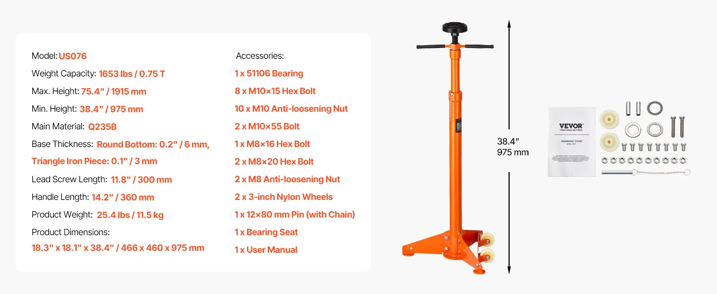 The jack stand locks into the primary height through the holes, and the rotation handle is equipped with thrust bearings, allowing for effortless and quick height adjustments even under heavy loads. Achieve simple and efficient lifting and lowering. Height adjustment range: 38.4" - 75.4".