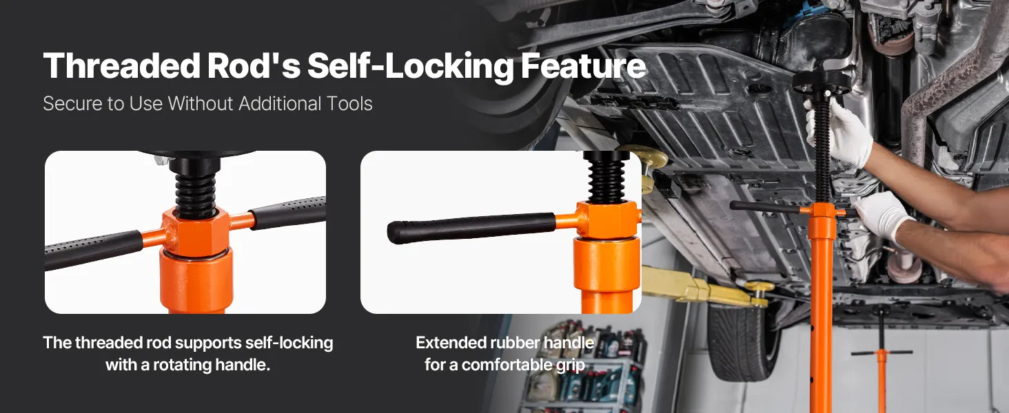 Self-Locking Feature for Easy Operation: The threaded screw rod provides a self-locking function to prevent the stand from lowering without assistance. Adjusting the under hoist jack stand under the vehicle is also very secure. The rubber handle provides a comfortable grip.