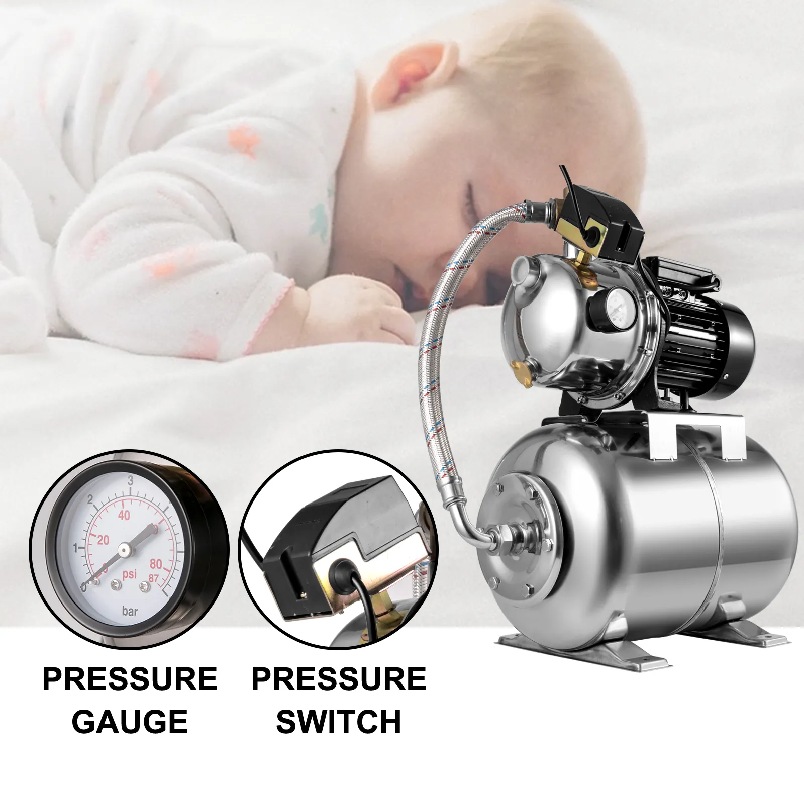 【ROESTVRIJ STALEN ONDIEPE WATERPOMP】- De jetpomp met ondiepe put bestaat uit een roestvrijstalen pompkop, een stalen tankslang van 4,8 gallon en een stalen druktank met manometer. Het is gemaakt van roestvrij staal, corrosiebestendig en roestvrij.